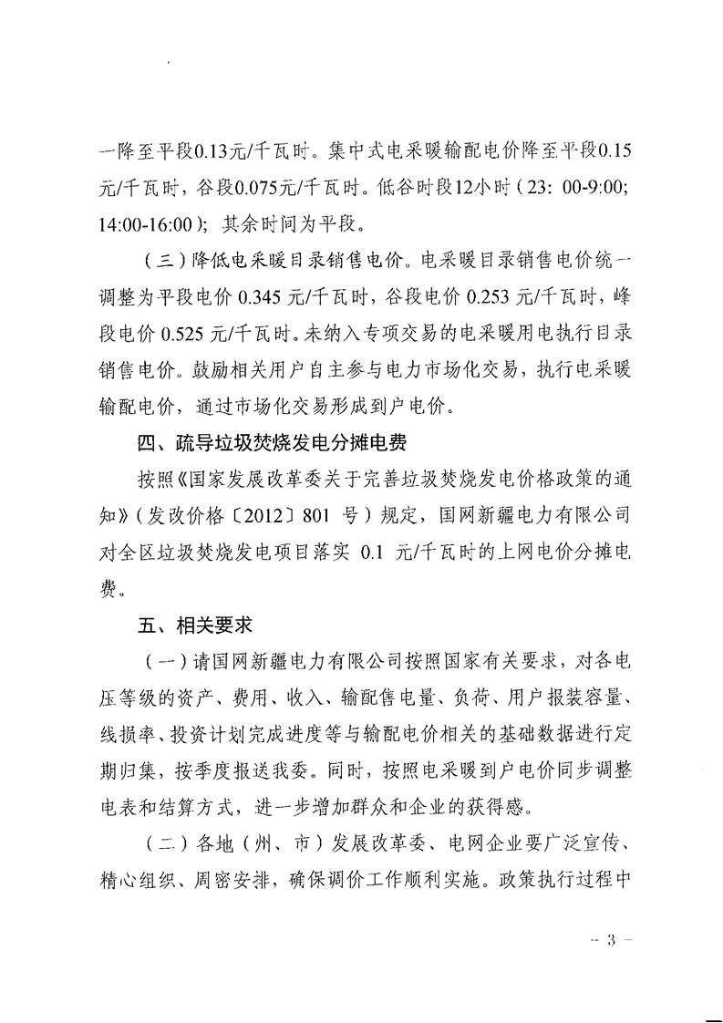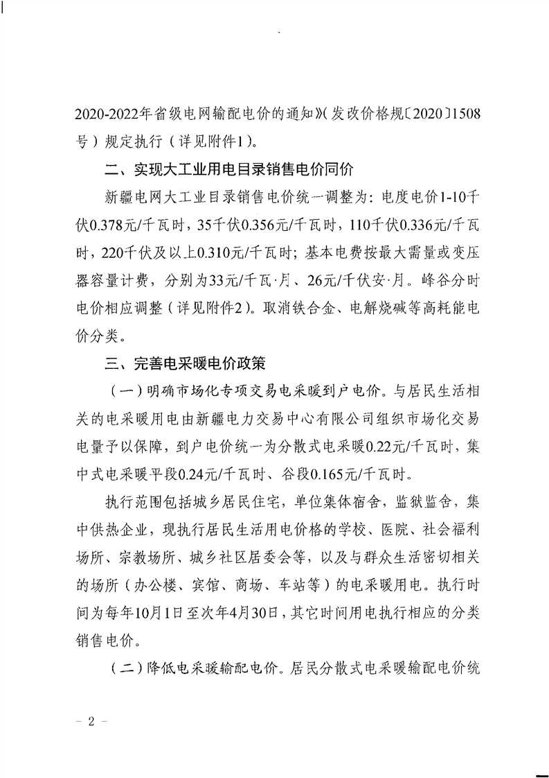 新疆自治区发展改革委印发《自治区发展改革委关于新疆电网电价调整有关事宜的通知》,其中到户分散式电采暖0.22元/千瓦时,集中式电采暖平段0.24元/千瓦时、谷段0.165元/千瓦时。